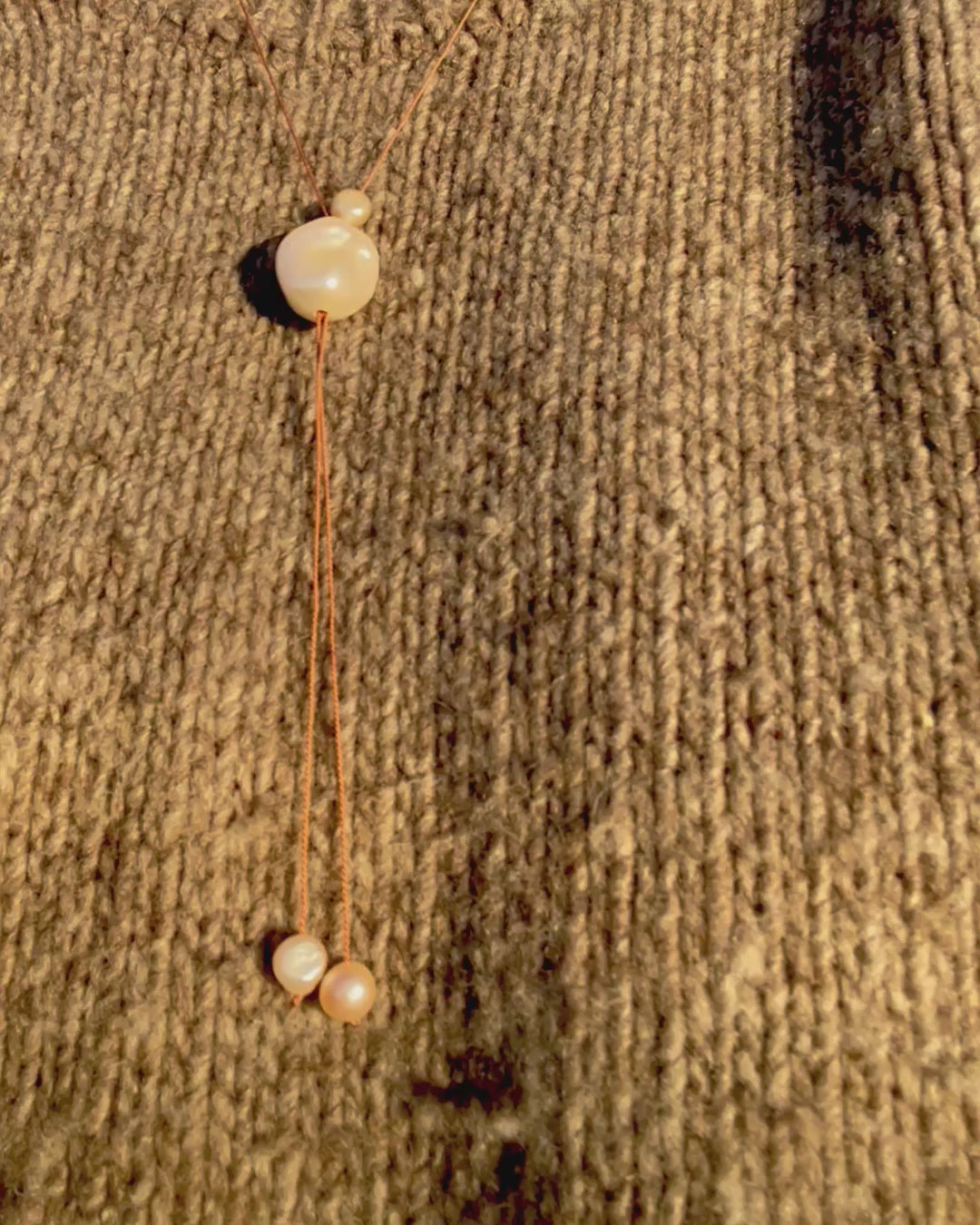 Large baroque pearl + silk cord + fresh water pearls. Necklace can be adjusted to be worn at any length.